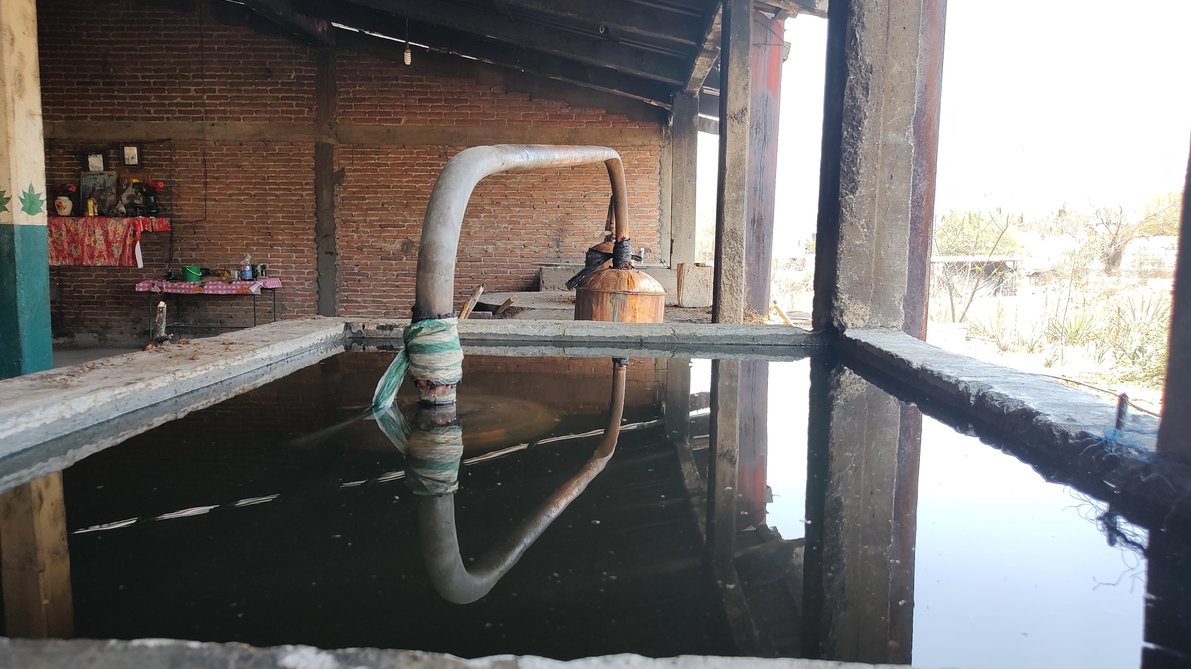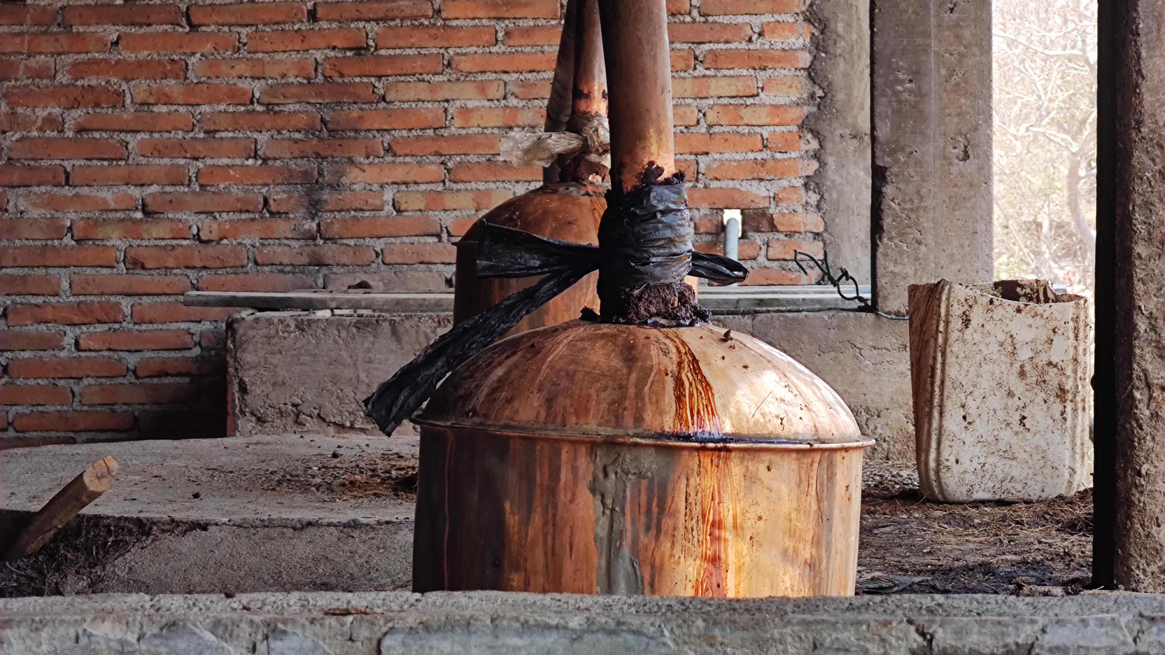 Los líquidos y fibras son introducidos a alambiques de cobre donde comienza la destilación. Se lleva a cabo una destilación doble para llegar a los niveles y sabores deseados.