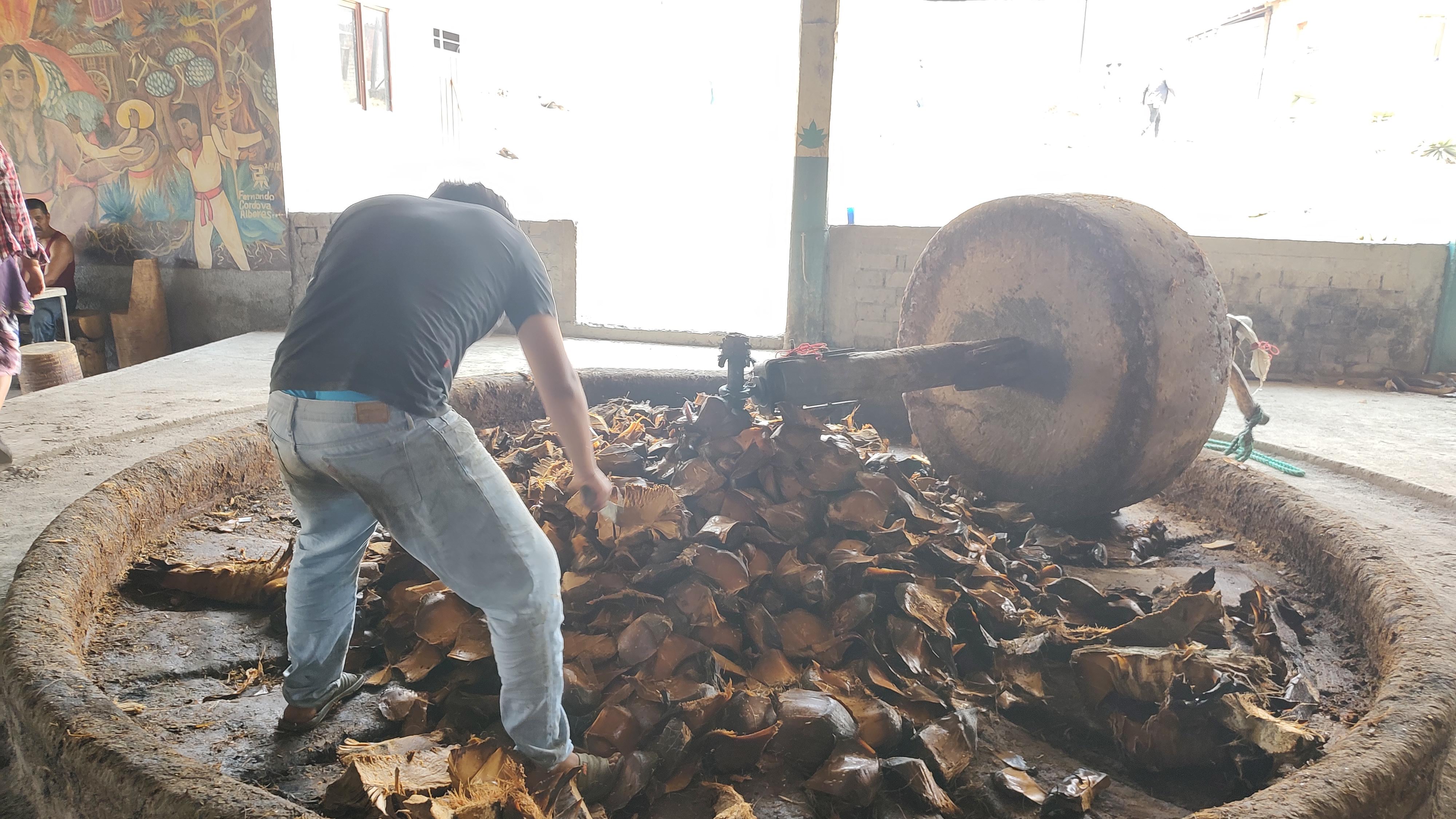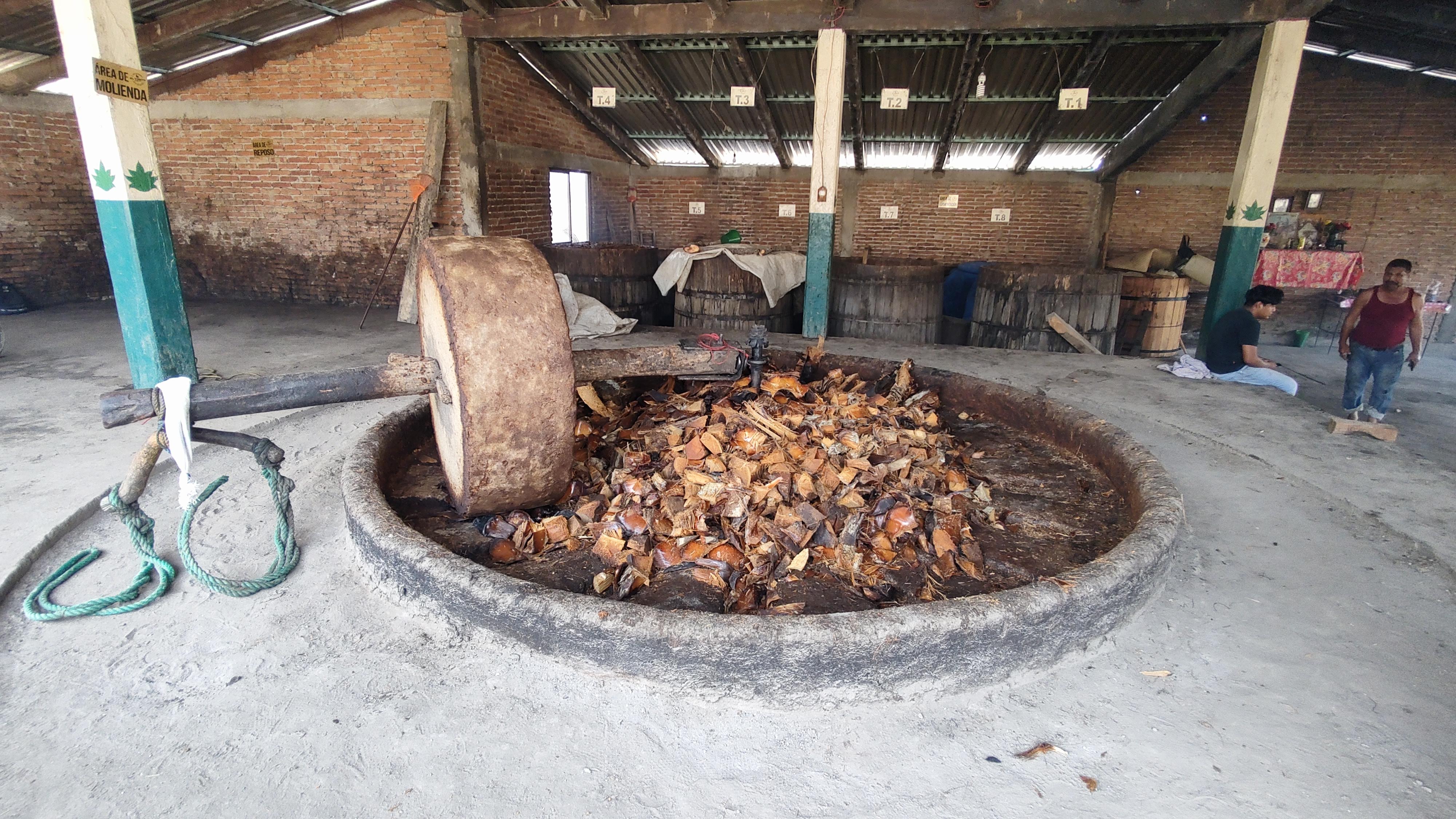 El maguey es molido con un molino de piedra echado a andar con tracción animal de una mula o caballo. La piedra extrae los jugos y azúcares del agave cocido.