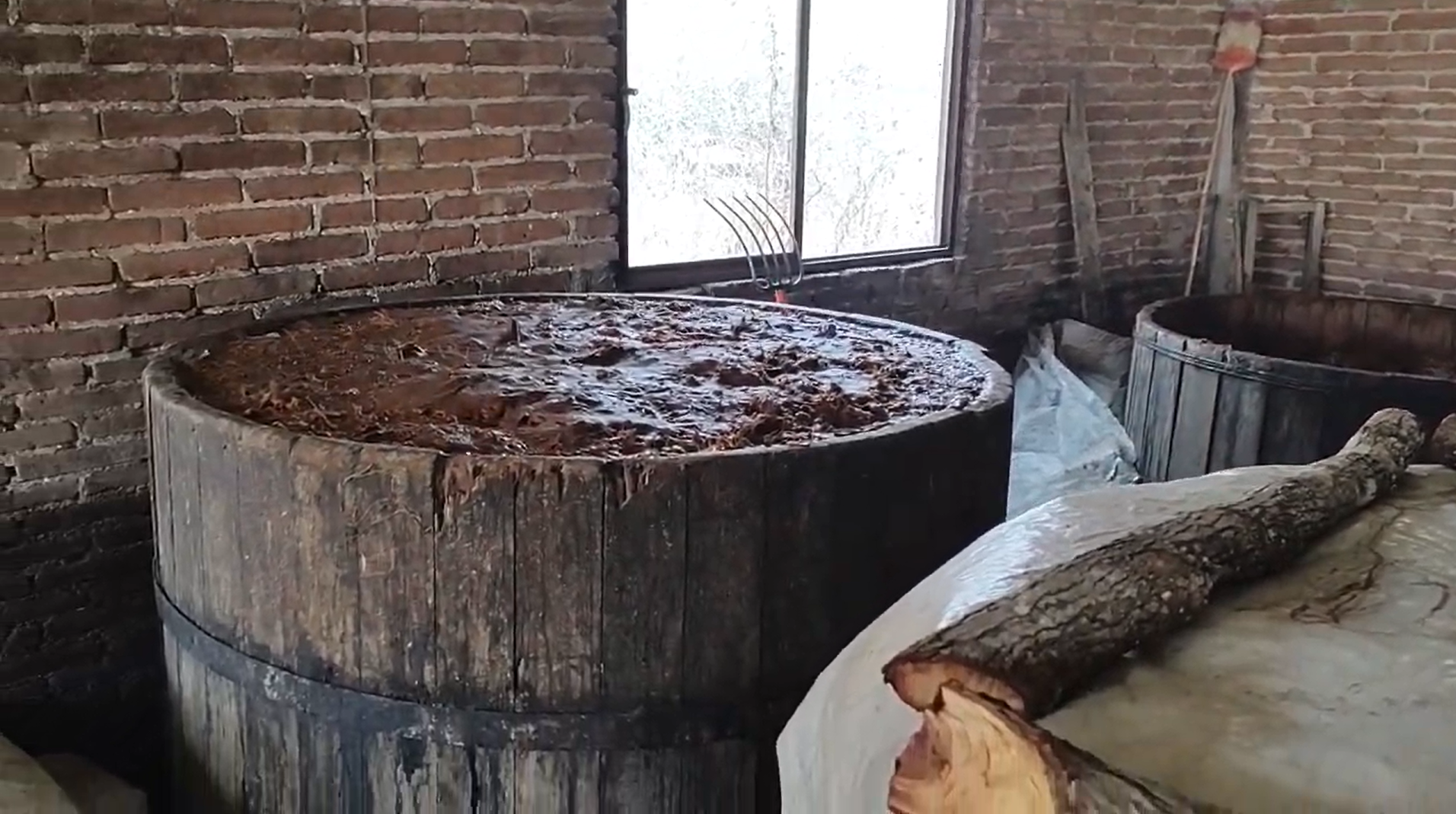 La fermentación se lleva a cabo en tinas de madera, donde se colocan los líquidos resultantes de la molienda para conseguir la transformación de los azúcares a etanol.